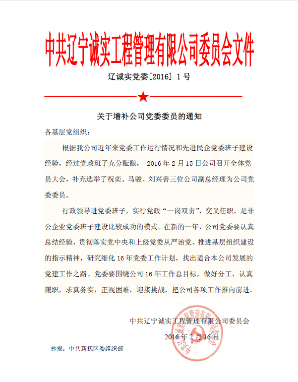 中共遼寧誠實工程管理有限公司委員會文件——關(guān)于增補公司黨委委員的通知